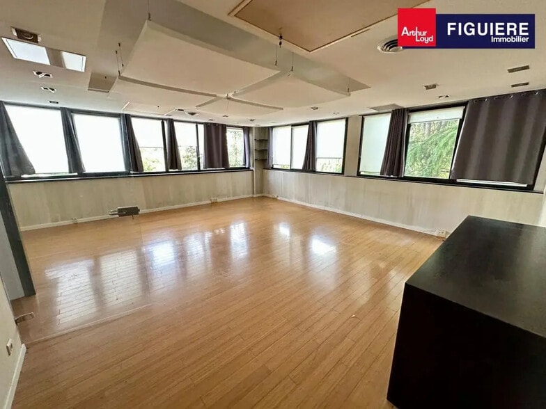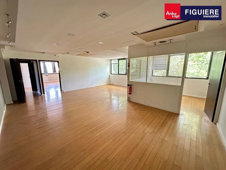 ARTHUR LOYD FIGUIERE IMMOBILIER vous propose une surface de bureaux de 139 m2 située au 1er étage au sein d'un ensemble immobilier tertiaire. A proximité des axes autoroutiers, vous bénéficierez d'un accès simplifié. L'immeuble est situé au sud du centre-ville d'Aix à quelques minutes des commerces et commodités. Les bureaux sont cloisonnés en plusieurs espaces et sont équipés de la climatisation réversible. 4 places de parking privatives comprises dans le loyer. Bâtiment sécurisé avec digicode à l'entrée Le Hall d'entrée et la cage d'escalier vont être refaits Ascenseur Climatisation en faux-plafonds:(gestion individuelle par bureau) Chauffage et eau collectif Dalles de moquette, murs peints, stores Sanitaires sur la pallier "privatif" Luminaires 60*60 intégrés en faux-plafonds Plinthes périphériques Alarme Double vitrage Possibilité point d'eau privatif Climatisation réversible en faux plafond Cloisons amovibles en partie Accueil 1 bureau Open space 4 places de parking privatives