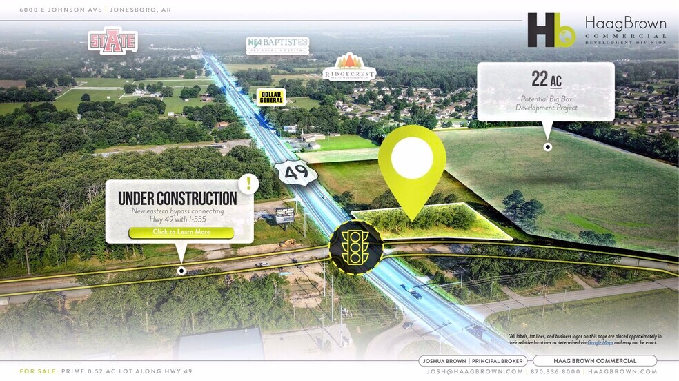 Haag Brown Commercial is proud to offer a prime 0.52 AC lot located within Farville Heights, one of Jonesboro’s most promising retail development sites. This hard corner lot is positioned at the entrance of what is anticipated to be the city’s next major retail hub, making it an ideal location for high-visibility businesses such as coffee shops, convenience stores, fast food establishments, or banks. Strategically situated at the signalized intersection of Highway 49 North and the new Eastern Bypass, this site serves as a critical access point for the new roadway connecting Highway 49 to I-555. With significant growth in the area, this intersection is positioned to become a regional powerhouse, offering unmatched exposure and accessibility. The lot is located on the “going to work” side of the road, ensuring a high volume of commuter traffic. Current drive-by traffic exceeds 25,000 cars per day and is projected to increase substantially with the completion of the Eastern Bypass. The site is in close proximity to several large-scale developments. It is just East of the new $400 MM NEA Baptist Health System Campus and the Ridgecrest Development, home of the 64,795 SF Ridgecrest Health and Rehabilitation Center. It also sits less than 600 yards from the new 80-acre Nettleton Baptist Church campus and is only 3 miles from Arkansas State University. The site also yields excellent exposure to drive-by traffic which currently exceeds 25,000 cars per day and is predicted to increase significantly with the new integration of the new Eastern Bypass. Farville Heights is well within Jonesboro city limits, has multiple access points, and offers all city utilities, making this 0.52 AC lot a prime opportunity for businesses looking to capitalize on a high-growth, high-traffic area.