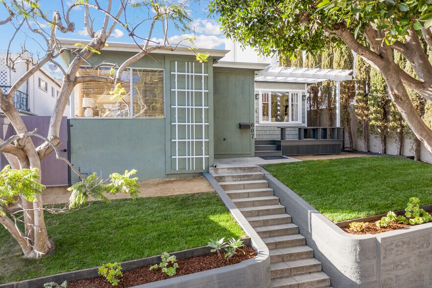 (LAST SALE PRICE NOT ACCURATE) Duplex + Office/Studio (ADU Potential - Can Be Easily Converted into an ADU with Kitchen & Bathroom for $2,000/month - Located 6 Blocks From the Beach and Main St) - Charming Craftsman-style duplex at 607 Ashland Ave, perched above a quiet, tree-lined street in Santa Monica’s highly desirable Ocean Park neighborhood, just four blocks to Main Street and six blocks to the beach. Both units feature private, separate entrances and are filled with natural light, offering hardwood floors, recessed lighting, skylights, and a newly constructed dog run along the side of the home. The 1-bedroom, 1-bath front unit includes an open kitchen, Dutch door, and a classic Craftsman front deck with built-in bench seating, ideal for al fresco dining. The 2-bedroom, 1-bath rear unit boasts a spacious open kitchen, vaulted ceilings, private front and rear gated entrances, and an expansive exclusive-use fenced courtyard designed for indoor-outdoor entertaining. A detached studio with high vaulted ceilings and an oversized skylight provides flexible use as a home office, fitness or yoga studio, or bonus space. This unique property offers exceptional flexibility and value, ideal for an owner-user, an income-producing duplex at strong current market rents, or potential reconfiguration into a single-family residence. Studio not included in total square footage.