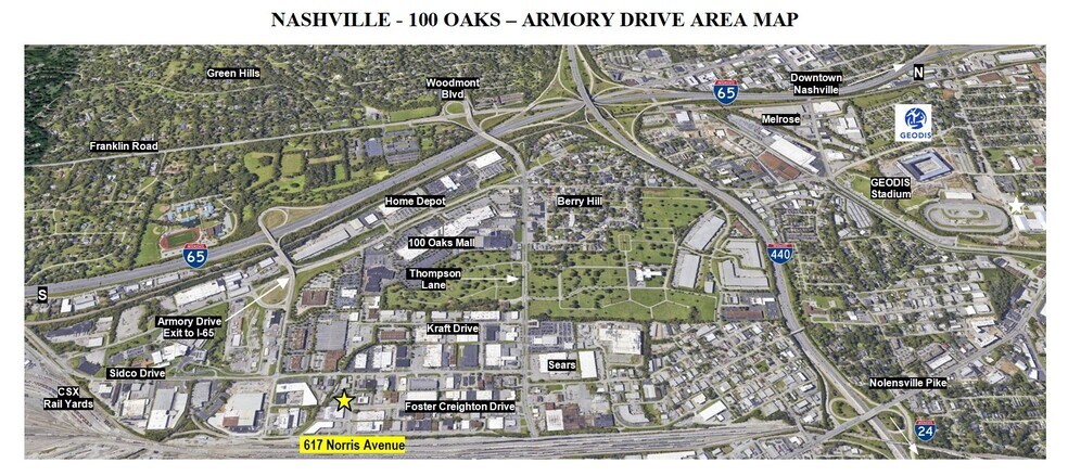 The property at 617 Norris Avenue consists of a one story Industrial Warehouse (21,000 SF) and Office (9,000 SF) Building located in the 100 Oaks, Armory Drive, area of West Nashville. The property is well located and has convenient access to I-65 and I-24.
