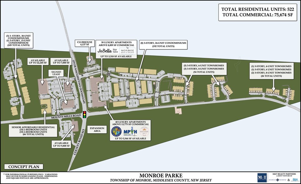 Brand new retail space available within Monroe Township’s premier mixed-use community. Signalized intersection frontage on Spotswood-Englishtown Road & Mounts Mills Road with strong daily traffic counts. Built-in customer base from hundreds of luxury apartments and townhomes within Monroe Parke. Rapidly growing residential population in the surrounding area, driving strong demand for retail, dining, and services. Modern construction with excellent curb appeal – designed to attract today’s discerning tenants and customers. Proximity to schools, parks, and major commuter routes ensures steady customer traffic.
