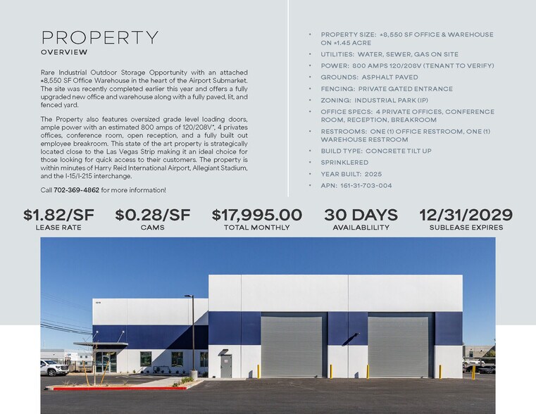 6248 Annie Oakley Drive is a ±8,550 SF Office/Warehouse on ±1.45 Acres featuring four (4) Private Offices, Conference Room, Reception, Break Room, one (1) Office Restroom, one (1) Warehouse Restroom, two (2) Grade-Level Loading Doors, Private Gated Entrance, and 800 amps 120/208 volt 3-Phase Power (*tenant to verify). LEASE RATE: $1.82/SF; CAMs: $0.28/SF; TOTAL MONTHLY: $17,995.00; AVAILABLE WITHIN 30 DAYS; SUBLEASE EXPIRES: 12/31/2029. This state of the art property is strategically located close to the Las Vegas Strip making it an ideal choice for those looking for quick access to their customers. The property is within minutes of Harry Reid International Airport, Allegiant Stadium, and the I-15/I-215 interchange. For more information or to schedule a tour, please contact Kyle Kirchmeier at 702-369-4862.