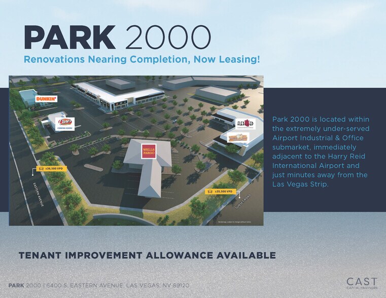Park 2000 est situé dans le sous-marché industriel et administratif extrêmement mal desservi de l'aéroport, à quelques minutes du Strip de Las Vegas. L'établissement est situé juste à côté de l'aéroport international McCarran avec un accès immédiat aux autoroutes inter-États. La zone environnante est un mélange mature et dense de résidences, de bureaux, de commerces de détail et d'industries, avec le plus grand parc de loisirs de l'État du Nevada juste de l'autre côté de la rue. Les nouveaux propriétaires prévoient d'importantes rénovations dans ce parc industriel bien connu, des annonces seront bientôt faites.