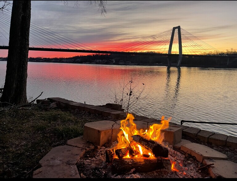 100 feet of Ohio River frontage with stairs to the water and dock-building rights. 2,880 sq ft across two fully finished levels. Expansive deck with 180-degree river views. Walkout game room with projector, bar setup, and fireplace. Multi-level patio, fire pit, and fixer upper pizza oven. 3 bedrooms / 2 full baths / 2 fireplaces / 2 driveways. Built 1934 — character that drives premium guest reviews and repeat bookings.