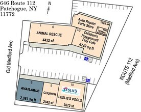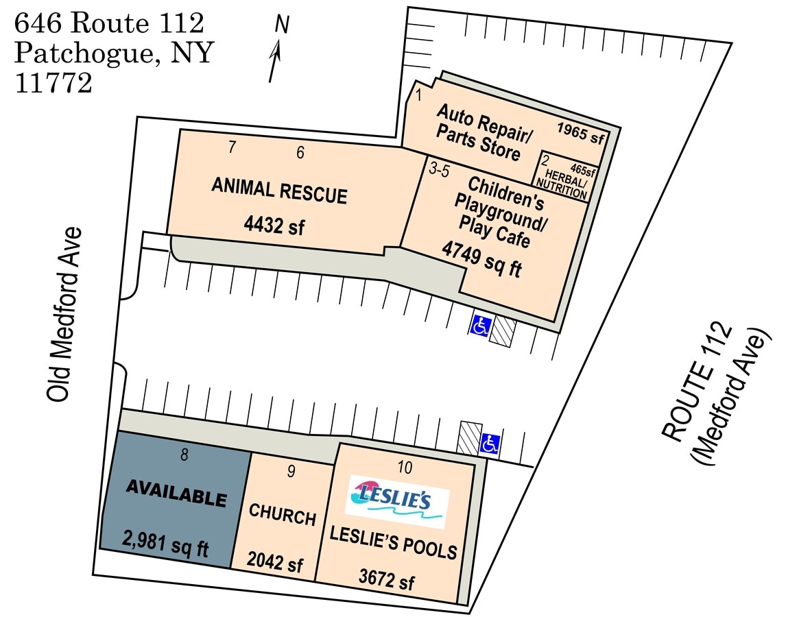 Centre commercial de 20 306 pieds carrés avec 59 places de stationnement sur place. Quartier résidentiel de banlieue, situé sur la route 112/Medford Avenue entre l'autoroute Long Island et la Sunrise Highway, entre Morris et Barton.