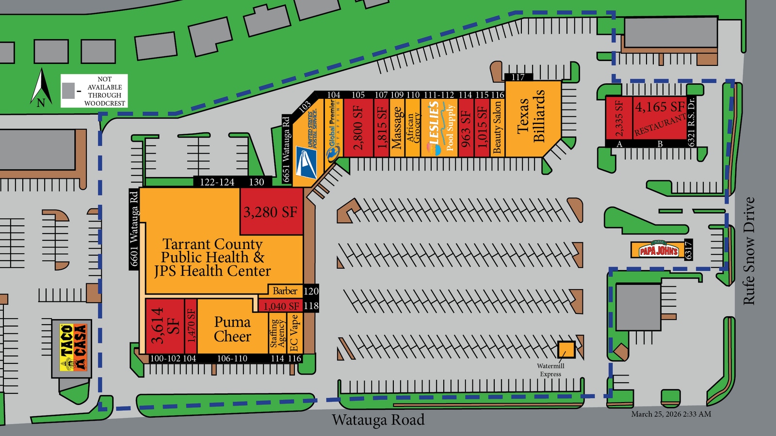 Watauga Marketplace est un centre commercial d'environ 72 000 pieds carrés situé à l'intersection animée de Rufe Snow Drive et Watauga Road. Ce centre a été récemment rénové et ses locataires incluent des restaurants locaux, des détaillants de services de quartier et des détaillants nationaux. Les suites commerciales de ce centre sont disponibles à la location pour tout type de magasin, qu'il s'agisse de vitrines de vente au détail traditionnelles, de restaurants, de bureaux ou de prestataires de services médicaux ou autres prestataires de services professionnels. Woodcrest Capital accueille les nouvelles entreprises et les entreprises franchisées dans ses centres avec des baux faciles à lire et des conditions flexibles. Woodcrest est également suffisamment sophistiqué pour plaire aux plus grands locataires du crédit national. Entreprise familiale spécialisée dans l'immobilier commercial depuis plus de 40 ans, Woodcrest possède et exploite tout, des centres de classe A situés dans les quartiers les plus fréquentés aux centres en difficulté qu'elle réhabilite dans des communautés rurales en difficulté. Appelez-nous dès aujourd'hui pour trouver le bon emplacement pour votre entreprise, car nous avons généralement plusieurs opportunités de vente au détail dans les environs immédiats !