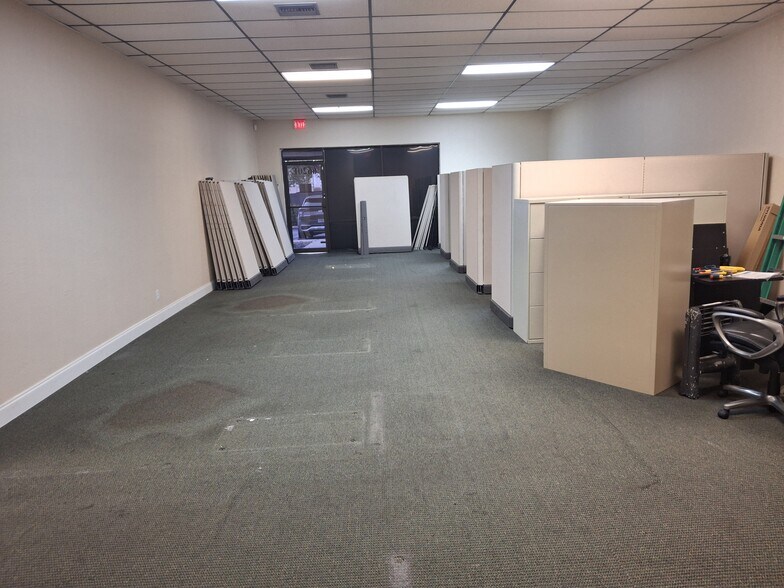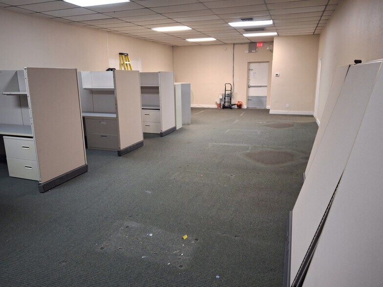 The space is finished and painted inside, there is carpet over the entire space. there are no interior walls in the space it is all open. There are cubicles shown in the pictures but they will have been removed.