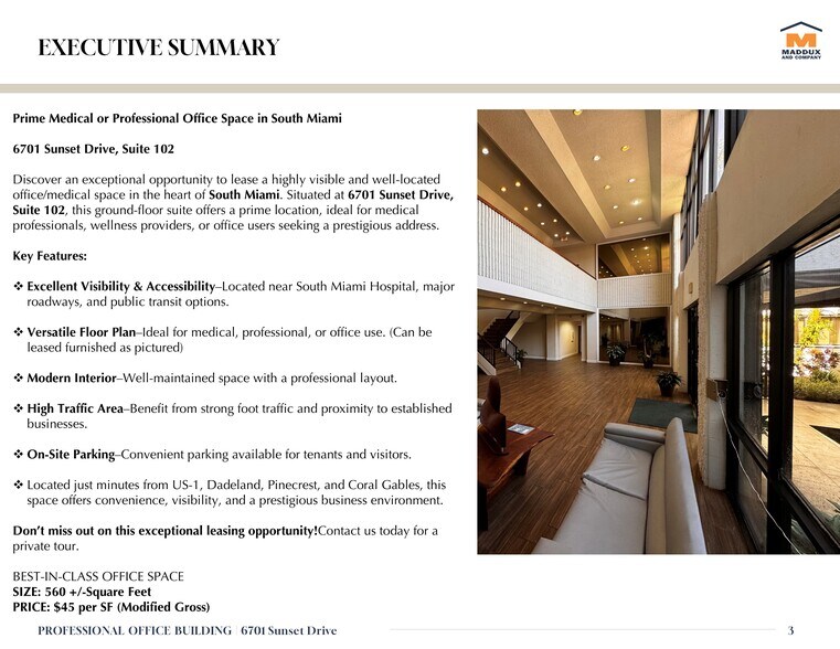 Discover an exceptional opportunity to lease a highly visible and well-located office/medical space in the heart of South Miami. Situated at 6701 Sunset Drive, Suite 102, this ground-floor suite offers a prime location, ideal for medical professionals, wellness providers, or office users seeking a prestigious address. Key Features: Excellent Visibility & Accessibility – Located near South Miami Hospital, major roadways, and public transit options Versatile Floor Plan – Ideal for medical, professional, or office use. (Can be leased furnished as pictured) Modern Interior – Well-maintained space with a professional layout. High Traffic Area – Benefit from strong foot traffic and proximity to established businesses. On-Site Parking – Convenient parking available for tenants and visitors.