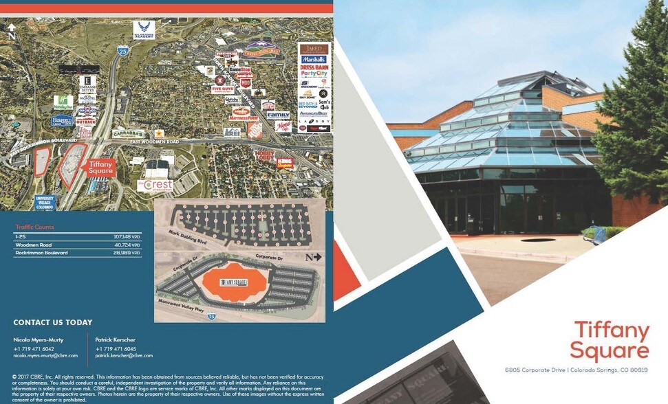 Tiffany Square is situated in beautiful northwest Colorado Springs with majestic mountain views along I-25 at the Woodmen Road exit. Enjoy easy access with downtown Colorado Springs just 10 minutes south, and downtown Denver just 60 minutes north. • Minutes from a multitude of restaurants, shops and hotels in the immediate area, and two regional shopping plazas at University Village Colorado and Chapel Hills Mall. • The surrounding area boasts strong demographics and a high concentration of upscale and affordable housing. • The area has a large concentration of military, aerospace and defense functions including the United States Air Force Academy and the University of Colorado at Colorado Springs.