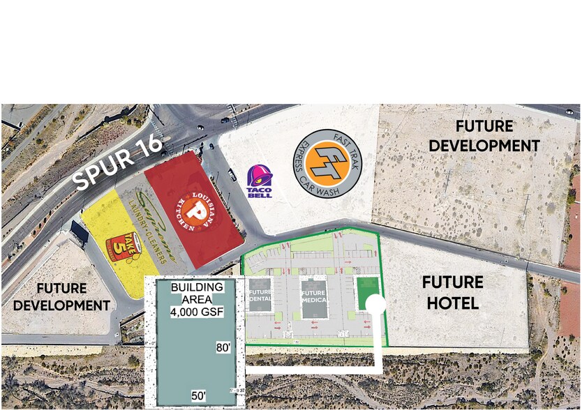 Situé dans la région en pleine croissance du nord-ouest d'El Paso, près de 6 500 nouveaux logements se développent à proximité En face de The Outlet Shoppes d'El Paso, qui accueille environ 12 millions de visiteurs par an (HGP) Importante population diurne dans la région avec un campus universitaire, des développements industriels, des centres d'appels, un lycée, un grand complexe de football, des restaurants, des concessionnaires automobiles et plus encore. À proximité du nouvel hôpital Tenet avec 140 lits et du Texas Tech Training Hospital avec 55 lits. Accès facile depuis et vers le Transmountain/Loop 375 et l'Interstate 10 Les améliorations en cours du corridor TXDOT I-10 devraient améliorer la fluidité du trafic dans la zone.