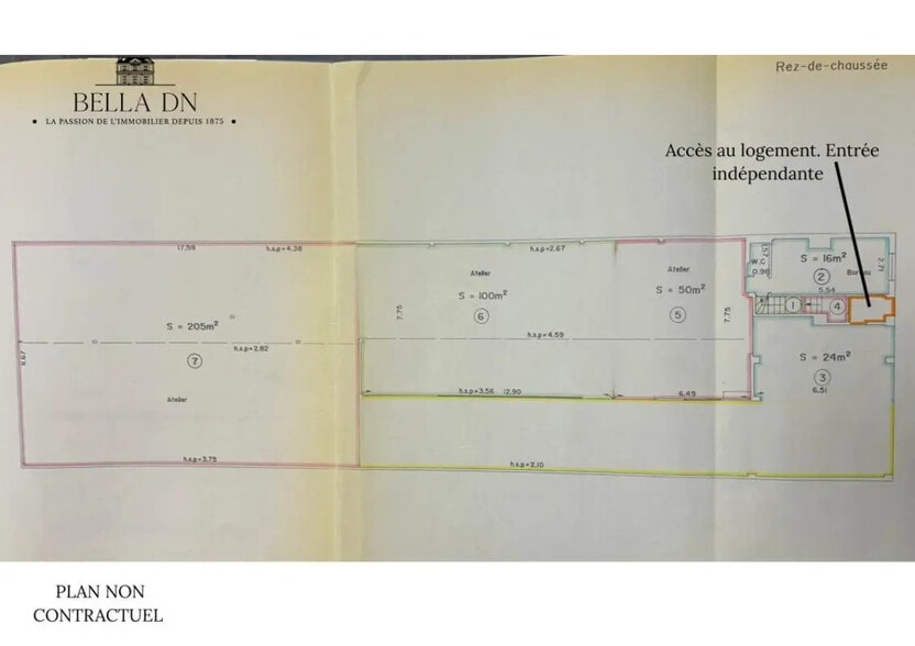 -Atelier de 492m2 environ avec hauteur sous plafond entre 2.80m et 4.60m. Ouverture en façade de 8M de large sur 4m de haut environ.