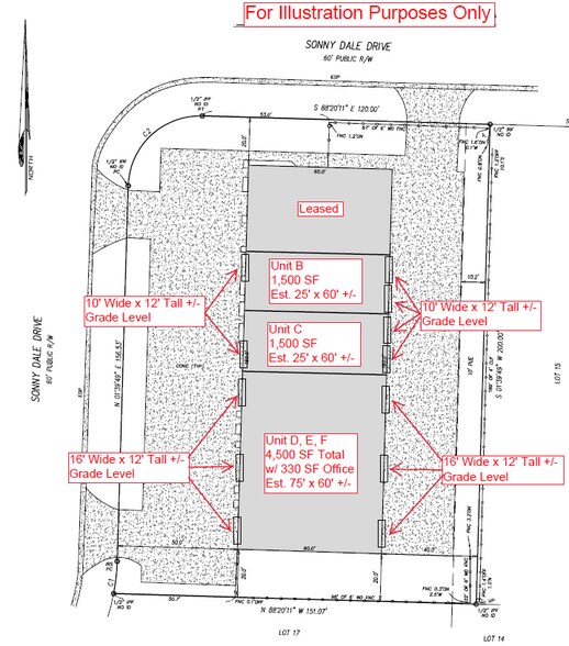 - Unit DEF: 4,500 SF +/-.Dimensions est. 75' x 60'. Est. 330 SF Office. Six 16' Wide x 12' Tall +/- Grade Level Doors
