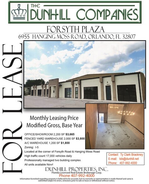 Office/Showroom space $3,665 per month. MG, Base Year