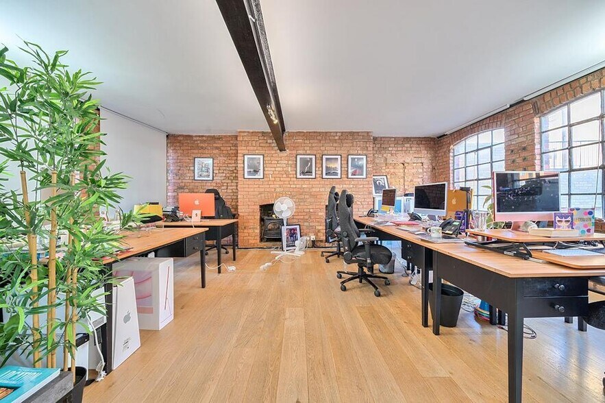 Set within a charming period building in the heart of Shoreditch, Unit 2 at 7–13 Cotton’s Gardens offers a beautifully presented second-floor workspace ideal for creative and design-led businesses. This 1,068 sq ft office combines authentic warehouse character with modern functionality, featuring exposed brick walls, industrial-style black ceiling beams, and large crittall-style windows that flood the space with natural light. The warm wooden flooring adds a refined contrast to the raw aesthetic, creating a professional yet relaxed atmosphere. The open-plan layout is currently configured to support collaborative work, with ample room for multiple desks and team zones. A fully glazed meeting room accommodates up to eight people, complemented by a sleek, fully fitted kitchen. Additional amenities include underfloor heating, WC and shower facilities, and thoughtful interior touches such as framed artwork and contemporary furnishings.