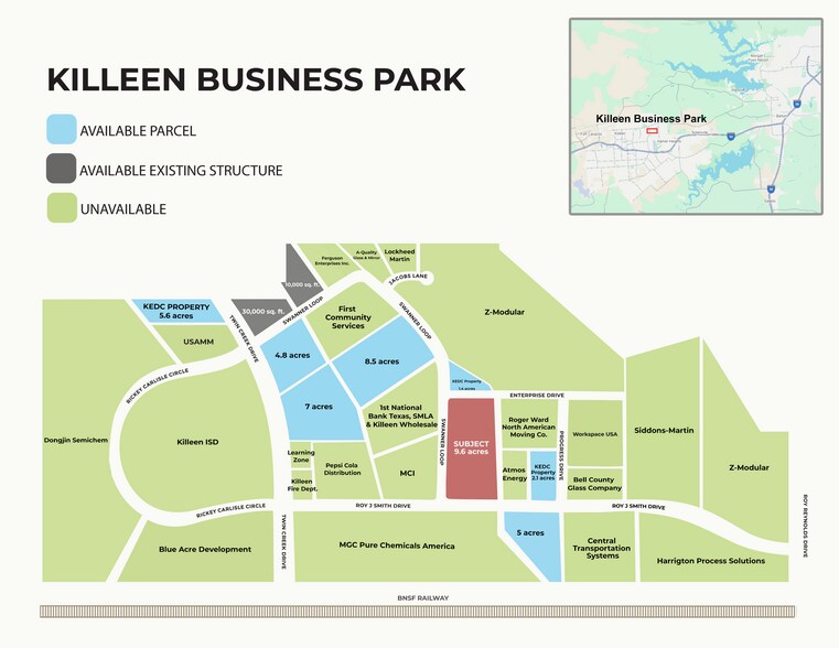 Les terrains du parc d'affaires de Killeen sont à vendre à des entreprises qui créeront de nouveaux investissements en capital et des emplois. La propriété est subdivisible.