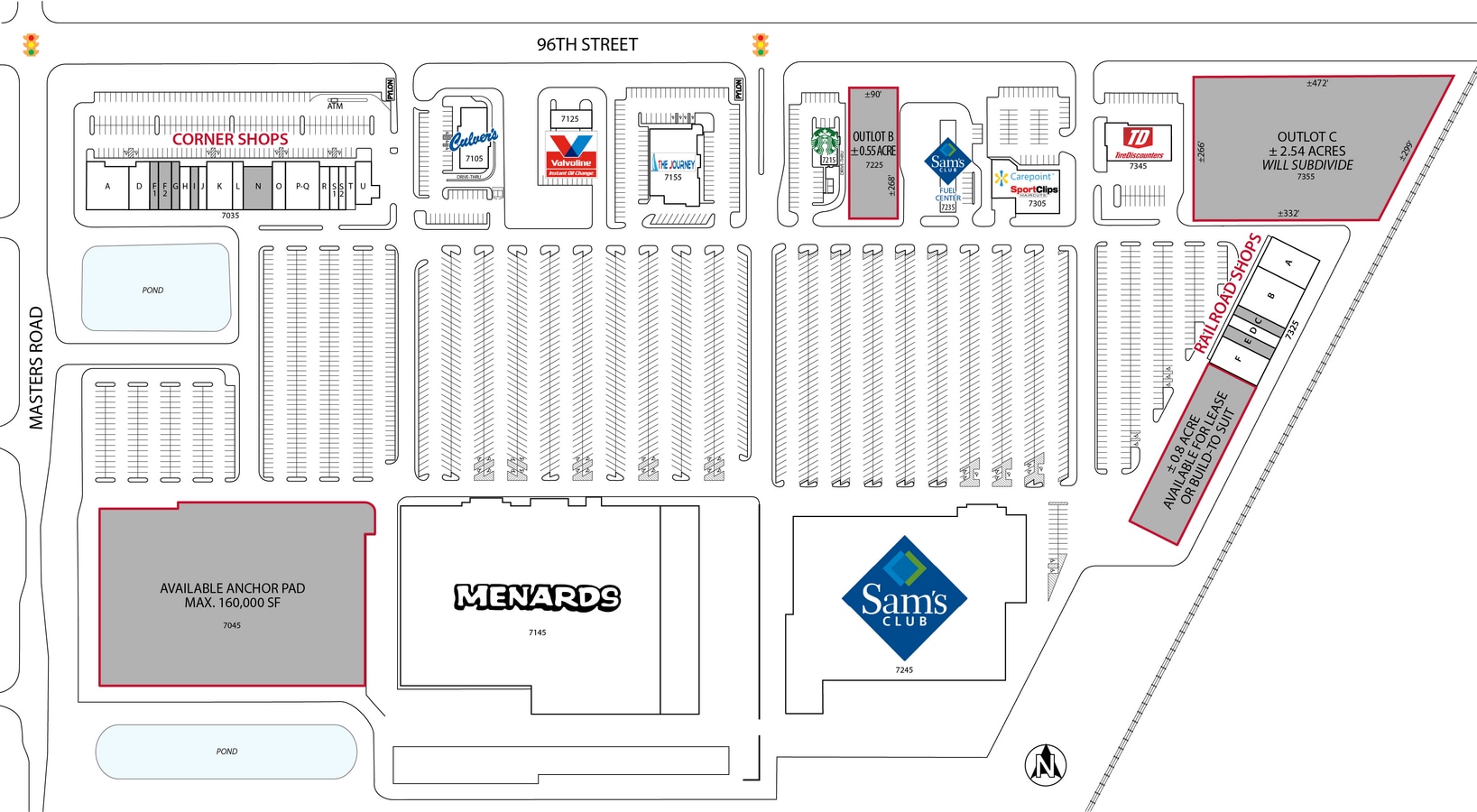 Centre commercial bien situé sur la très animée 96e rue Ancré dans l'ombre par Sam's Club et Menards Support d'ancrage disponible pour construire jusqu'à 160 000 pieds carrés Lots disponibles de ±0,55 à ±2,54 acres Excellente visibilité sur les principaux axes routiers