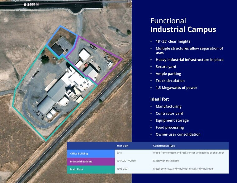 A 73,300 SF industrial/manufacturing campus on 8.25 acres, offering a rare combination of heavy power, multiple buildings, dock-high and grade-level loading, and strong truck circulation in a rapidly growing market. The property is vacant and ready for immediate occupancy, positioned near regional rail access that connects directly to Union Pacific’s Shafter Subdivision mainline, and benefits from newly granted MIDA approval, enabling expanded industrial and defense-aligned uses as well as streamlined entitlement pathways. This asset is ideal for owner-users, manufacturers, or groups seeking a strategically located, flexible, and infrastructure-rich industrial facility.