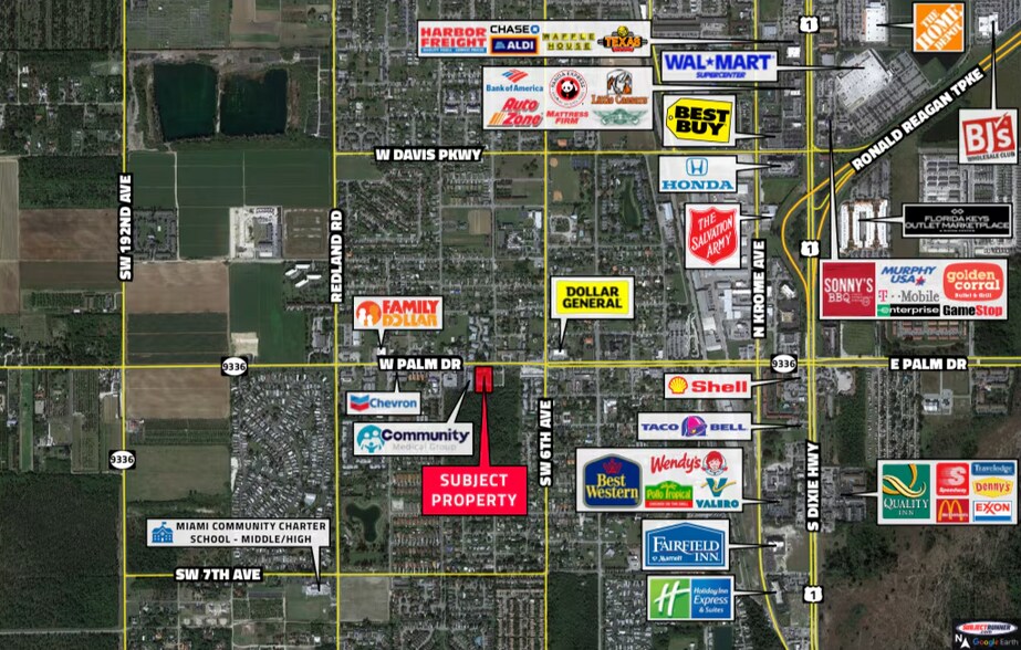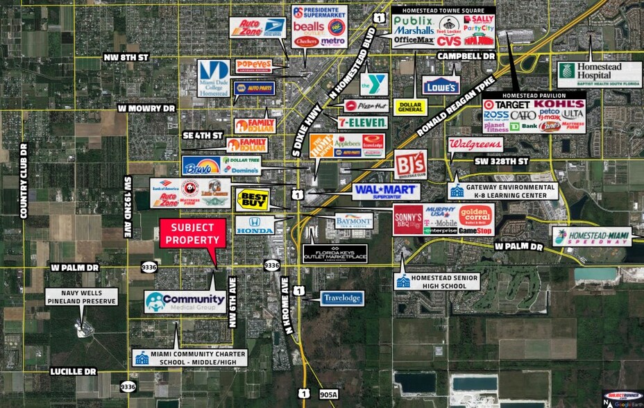 Florida City sits at the heart of Miami-Dade County's most explosive growth corridor. The 1-mile radius surged 17.18% in population from 2020 to 2025 and is projected to grow an additional 9.51% through 2030, approximately nine times the national average. Growth is driven by the adjacent 2.4 million SF Amazon South Dade Distribution Center, Homestead Air Reserve Base (7,200 personnel), and the Florida Keys gateway economy. Median household income within 1 mile is $51,659. The property is located less than 1 mile from Route 1 and the Ronald Reagan Turnpike.