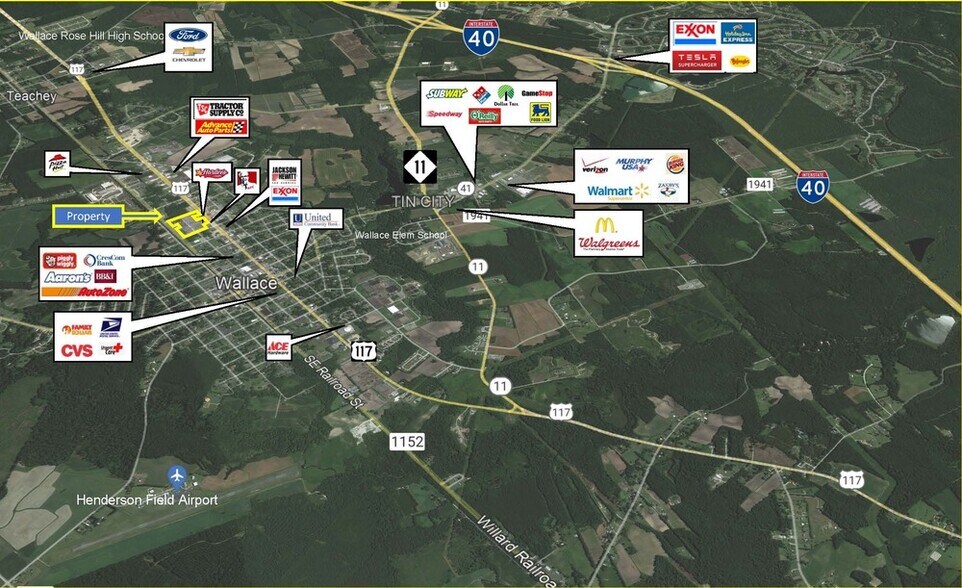 - Situé sur le corridor commercial américain 117 de Wallace, y compris Farmers Home Furniture, Tractor Supply, Builder's Discount Center, CVS, Piggly Wiggly