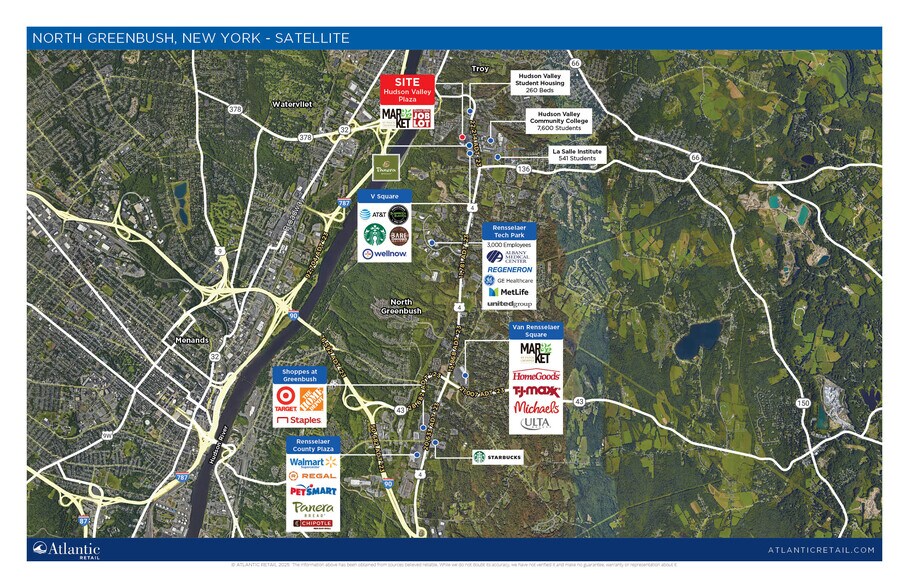 Le Hudson Valley Plaza est situé sur la route 4, juste en face du Hudson Valley Community College. Ancré par un marché 32 et des lots d'emplois à Ocean State. Intersection signalée par un panneau à pylône. À proximité de la route 378, de l'I-787 et de l'I-90. À 1,6 km du parc technologique de Rensselaer avec 2 500 employés, dont Regeneron, l'hôpital du centre médical d'Albany et MetLife. Entouré de nouveaux logements unifamiliaux, de maisons en rangée et de logements étudiants.