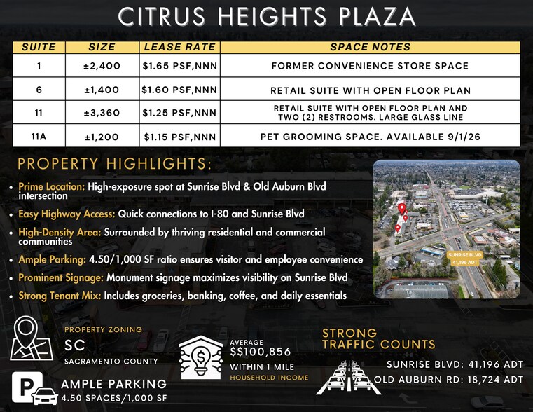 Citrus Heights Plaza offers a range of retail suites at one of Citrus Heights' most visible intersections — Sunrise Blvd and Old Auburn Blvd — with over 41,000 vehicles passing daily. The center sits in a high-density corridor surrounded by established residential neighborhoods and a strong daytime population, with average household incomes exceeding $100K within a mile. Multiple suite sizes are available now (with one coming online September 2026), making this an ideal fit for a variety of retail concepts — from food and beverage to service, wellness, or specialty retail. Tenants benefit from excellent monument signage on Sunrise Blvd, abundant parking at 4.5 spaces per 1,000 SF, and quick access to I-80. The existing tenant mix — groceries, banking, coffee, and daily essentials — drives consistent foot traffic and supports strong cross-shopping.