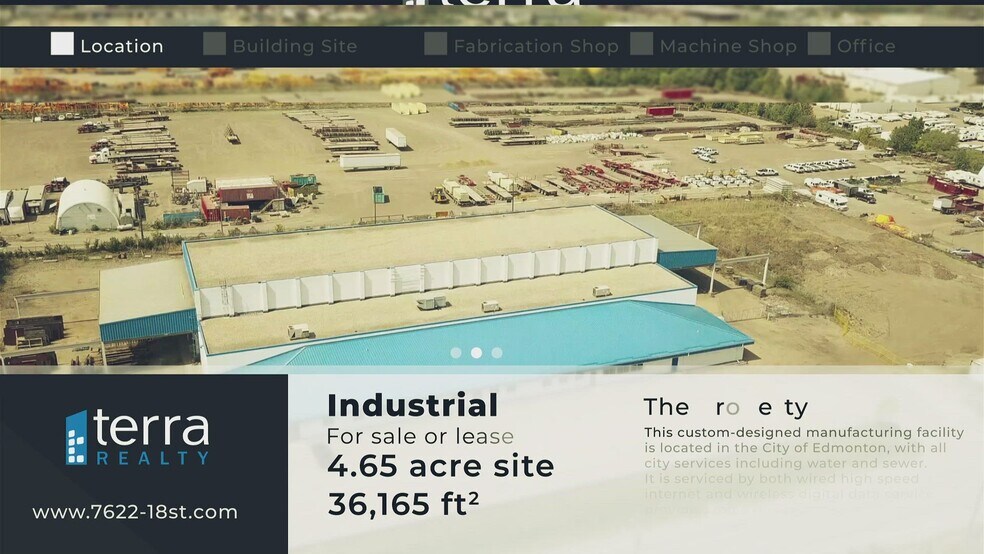 This property is an industrial development that comprises a low site coverage ratio of 18%. The fabrication shop, which represents the majority of the warehouse space, entails a 37’ ceiling height which facilitates work on larger projects and is desirable for industrial fabrication facilities. Furthermore, the subject facility has been constructed for heavy industrial use with features including, but not limited too; extra steel reinforced flooring, concrete-masonary-pillasters on 15' centers, and 1,600 amp, 480 volt service and more. The property also features extensive overhead cranes and outdoor crane extensions on both the northern and southern peripheries of the building and a drive-through yard area. Great forethought went into the design of this facility: there is straight-line flow from raw materials receiving and storage to finished goods storage and shipment for maximum LEAN Manufacturing and Continuous Flow potential, with a connected machine shop and fabrication shop while maintaining air separation through an Air Management System. See property website www.7622-18st.com for comprehensive construction details. Highlights include: Concrete The fabrication and machine shop are constructed of a load-bearing concrete masonry-pilaster-lintel-insulated-masonry-infill wall system, the pilasters being 15’ on centre providing for overhead crane rail and roof structure support. The wall system incorporates air and vapour protection through the proper application of an Alkyd based paint on the interior and latex paint on the exterior (a repaint with a special thermal latex coating is scheduled for this fall or next spring). The concrete grade beams and floor slabs include extra steel reinforcing capable of supporting heavier than typical loads. Doors Along the south perimeter of the facility, a 15 foot by 16 foot powered overhead door and a man-door provide access to the machine shop. Two 20 foot by 18 foot specially designed bi-parting sliding doors provide access to the fabrication shop, one on the southend and one on the north-end. Along the rear of the facility (west side), two man-doors and an 18 foot by 16 foot powered overhead door provide additional access to the fabrication shop as well as one additional man-door on the north perimeter. A 10 foot by 12 foot powered overhead door and a man-door along the north perimeter of the machine shop provides access to the parts and tool crib area situated adjacent to the machine shop area. Loading docks are at grade level. Work Stations The machine shop includes a foreman’s office next to the parts and tool crib area. The fabrication shop includes a clean assembly/paint room and paint storage room. Work stations along the east and west walls of the fabrication and machine shops each have a complete distribution system for four process gases (carbon dioxide, oxygen, propane and compressed air) and 110 volt, 20 amp duplex receptacles on dedicated circuits. Paint Shop A roofless open top paint shop allows crane access for placing and handling materials. Regular overhead lighting is supplemented with wall-mounted lighting, with rails embedded in the floor for carts to facilitate the movement of heavy machinery. There is also a ventilated paint storage room adjacent to the paint shop. Mechanical The office is serviced by two heating and air conditioning roof top units. The shop areas are heated by gas fired radiant tube heaters and are kept clear of cutting and welding smoke via a special 30,000 CFM make-up air and exhaust system. The building features a 3 phase, 1,600 amp, 480 volt service. Cranes & Crane Rails The building, being designed specifically to facilitate the steel manufacturing of heavy equipment attachments, includes an extensive system of cranes and crane rails entailing a total crane rail length of 2,160 feet, designed to accommodate 10 cranes, 8 in the fabrication shop and two in the machine shop. Special engineered crane rail mounting brackets were built into the concrete pilasters with precision. The fabrication shop crane system is a unique design incorporating two layers to facilitate an efficient steel manufacturing process. The top layer accommodates two parallel crane systems running the full length of the fabrication shop with three 5 ton cranes on a 40 foot span and a 15 ton and 5 ton crane on a 30 foot span, all with under hook clearance of 21 feet. A 3 ton monorail crane is suspended between the top layer crane systems. On the lower layer, spanning the full 70 foot fabrication shop width having a 17 foot under hook clearance, are two 5 ton cranes, each able to travel 80 foot out of each end of the fabrication shop to bring in raw material and take out finished product. One-half (40 feet) of each 80 foot outside crane rail section is covered with a metal roof system complete with panel rib skirting to protect the crane ducto-bars from the elements. The design allows for covering the other half in the future if the need arises. Specially engineered vertical-lift powered crane door systems with positive weather seals are included which allow the passage of the lower level 5 ton cranes from the interior to the exterior crane runways and are designed to drastically reduce heat loss due to infiltration. Air Management The atmospheres of the office, machine shop and fabrication shop are designed to maintain separation. Component parts receiving and storage are covered by cranes for movement into the machine shop; the office is slightly pressurized with double door vestibule separation between the office and the shop to eliminate shop dust and smoke incursion. The shop make-up air system discharges into the machine shop. Open forklift access routes and wall fans push clean air into the fabrication shop, while wall-mounted exhaust fans on the far side of the fabrication shop draw air away from the machine shop and discharge dirty air to the outdoors. Piping and Electrical Pipe manifolds distribute bulk gasses and compr