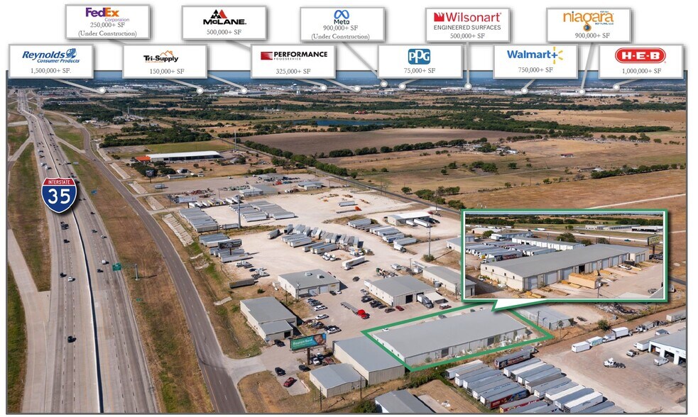 Interstate Business Center is an established industrial park spanning approximately 18.59 acres and comprised of 10 freestanding steel-frame buildings with concrete foundations. Strategically located along Interstate 35, the property offers unmatched highway access and visibility, providing a significant logistical advantage. Half of the park lies within the unincorporated area of Bell County, while the other half is in the City of Temple, Texas. Each building is designed for modern industrial use, featuring dock-high and grade-level overhead doors, fenced parking, and on-site utilities including Pendleton Water Supply and septic systems. Positioned along a major transportation corridor with traffic counts exceeding 93,000 vehicles per day, this location is ideal for distribution and light manufacturing operations.