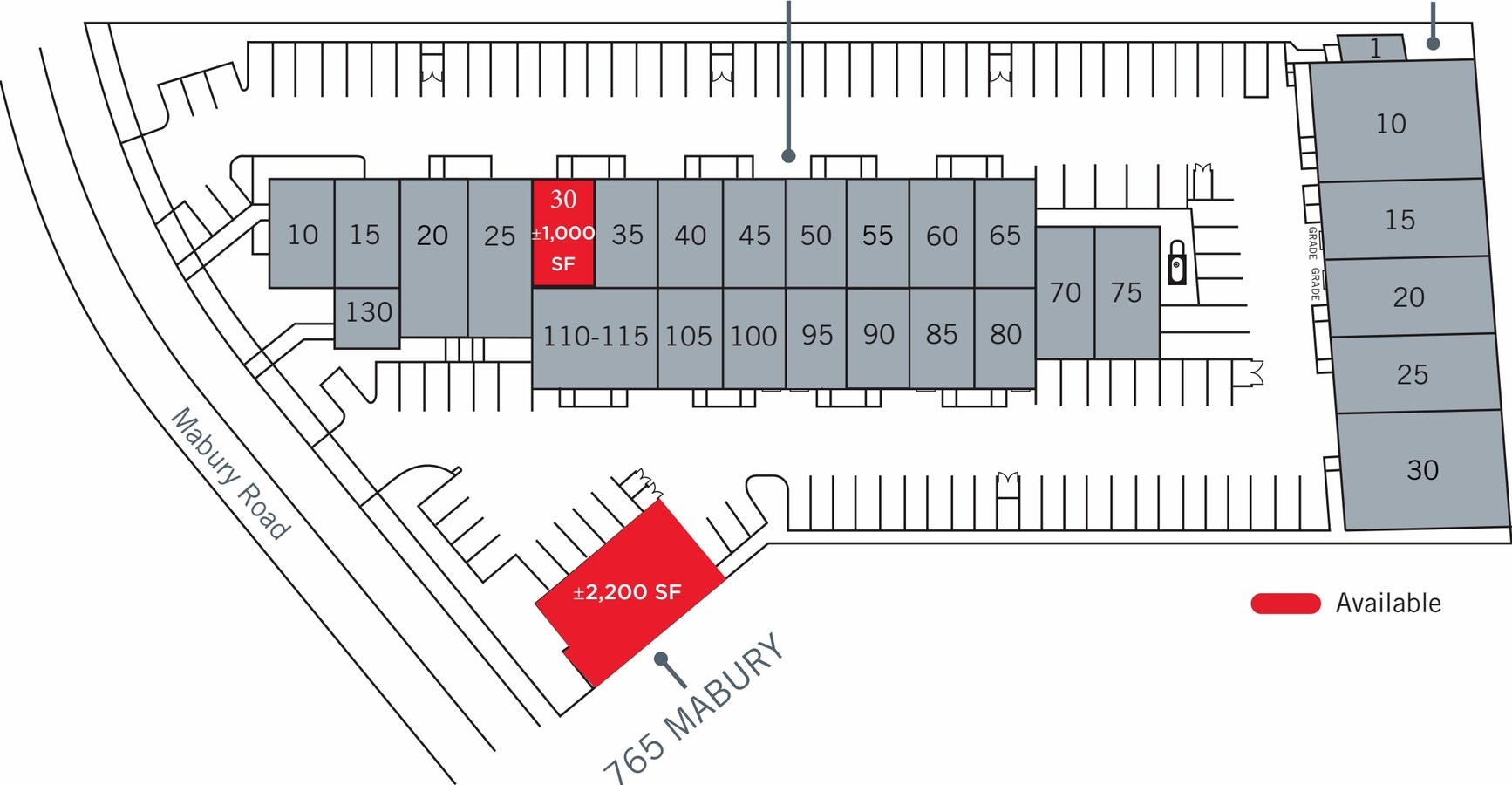 Freeway Business Park is located at 761–765 Mabury Road in San Jose, California. The property consists of multiple industrial/flex units with on-site parking and access to major highways, including 101 and 880. The site plan includes designated warehouse and office areas, and the project offers internal expansion options.