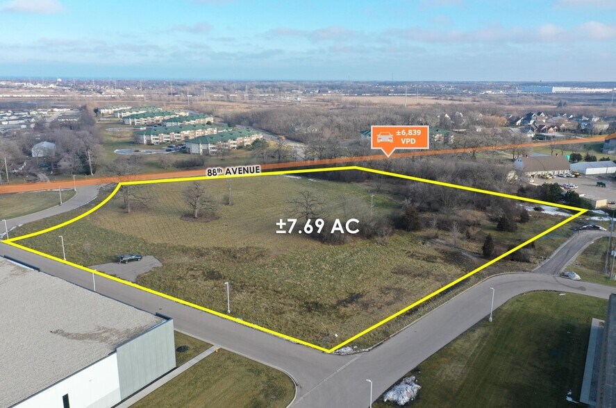 Terrain partiellement défriché de 7,69 acres dans la zone industrielle/commerciale de Pleasant Prairie. Grande façade sur la 88e avenue. 3,75 acres supplémentaires disponibles pour un total de 11,4 acres