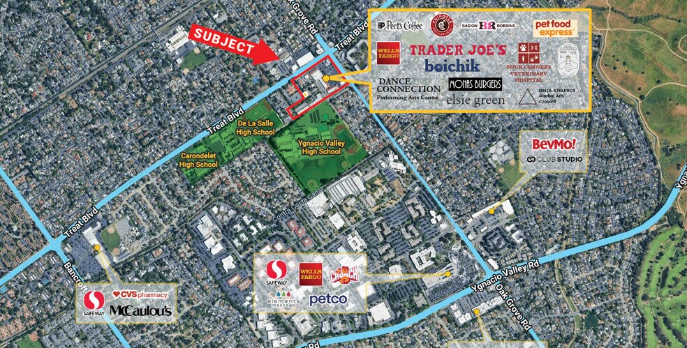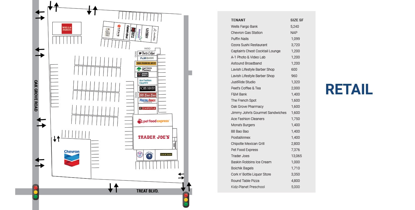 A busy ±70,000 sf neighborhood center serving a large, affluent population Anchored by a busy Trader Joe’s, Oak Grove Plaza has a strong mix of national and local tenants including PetFood Express, Peet’s Coffee, Chipotle, Wells Fargo Bank, Baskin-Robbins, Just Ride Cycling, and neighborhood favorite Mona’s Burgers. Other notable tenants include The French Spot, a Michelin-credentialed pastry shop and New York Times-heralded Boichik Bagels. Adjacent to the retail center (and part of), is the Oak Grove Business Center with Four Corners Veterinary Hospital, Curves, KidsPlanet Learning Center, and Round Table Pizza. With a strong mix of retail, dining and services, this daily needs center is always busy!