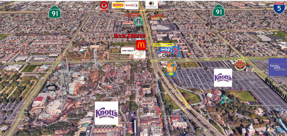 The subject property is located near the signalized intersection of Beach Boulevard and La Palma Avenue, approximately 0.5 miles from the 91 Freeway, offering excellent regional accessibility. The immediate trade area is anchored by a strong mix of national retailers, restaurants, and hospitality operators, including Knott’s Berry Farm, McDonald’s, Motel 6, Claim Jumper, Chase Bank, IHOP, Broken Yolk Café, Rock & Brews, and numerous additional destination-oriented uses.
