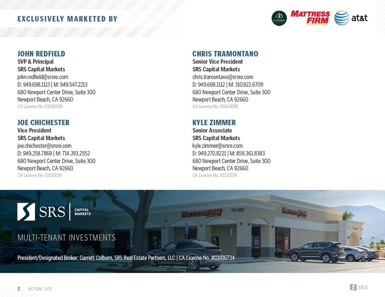 SRS Multi-Tenant Investments is pleased to offer the opportunity to acquire the fee simple interest (land & building ownership) in a 3-tenant, freestanding pad located in La Quinta, CA (Coachella Valley MSA). The property is positioned on a 1.32-acre parcel and is comprised of 3 suites totaling 10,500 SF. In addition, the tenant lineup is comprised of a diverse mix of ecommerce resistant tenants and includes Mattress Firm, AT&T, and Brother’s Nails & Lashes. Brother’s Nails and Lashes recently signed a brand new 10-year lease bringing the properties’ weighted average lease term remaining (WALT) to 8.4 years, demonstrating their long-term commitment to the trade area and reducing the risk of near-term rollover. All leases are structured as net leases and feature scheduled rent increases, minimizing expense leakage for a future investor and providing a hedge against inflation.