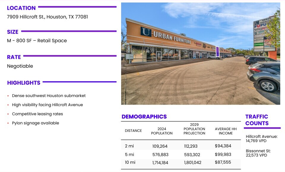 Retail Space Available – 800 SF 7909 Hillcroft St., Houston, TX 77081 Now available is a 800 SF retail space ideally positioned along Hillcroft Street, a well-trafficked commercial corridor serving a dense residential and business community. This compact yet efficient suite offers excellent visibility, convenient access, and strong signage potential, making it ideal for neighborhood retail, service-oriented businesses, or specialty concepts. The property benefits from its proximity to major thoroughfares, established surrounding retail, and consistent daily traffic. With flexible layout potential and on-site parking, this space provides an excellent opportunity for tenants seeking a strategic footprint in a proven retail location. Perfect for local operators or expanding concepts looking to establish a presence in a high-demand submarket of Houston.