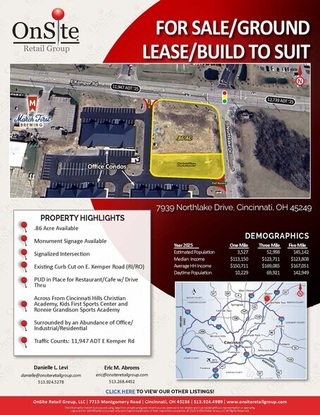 Located in Cincinnati’s dynamic Blue Ash area, this 0.86-acre site is surrounded by a dense mix of office, industrial, and residential developments. The parcel sits at a signalized intersection with traffic counts exceeding 11,900 vehicles per day on East Kemper Road and 12,700 on Northlake Drive, providing excellent ingress and egress. Nearby amenities include March First Brewing, Cincinnati Hills Christian Academy, and multiple sports complexes, creating a vibrant environment for retail or restaurant concepts. With PUD approval for food service uses and monument signage available, this site is ideal for operators seeking visibility and convenience in a thriving commercial corridor.