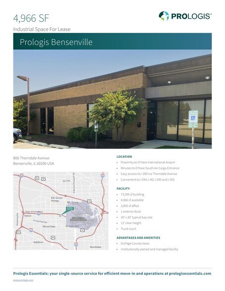 LOCATION • Proximity to O’Hare International Airport • Minutes to O’Hare South Air Cargo Entrance • Easy access to I-390 via Thorndale Avenue • Convenient to I-294, I-90, I-290 and I-355 FACILITY • 73,249 sf building • 25,888 sf available • 12,655 sf office • 5 exterior docks • 30’ x 30’ typical bay size • 12’ clear height • Truck court ADVANTAGES AND AMENITIES • DuPage County taxes • Institutionally owned and managed facility