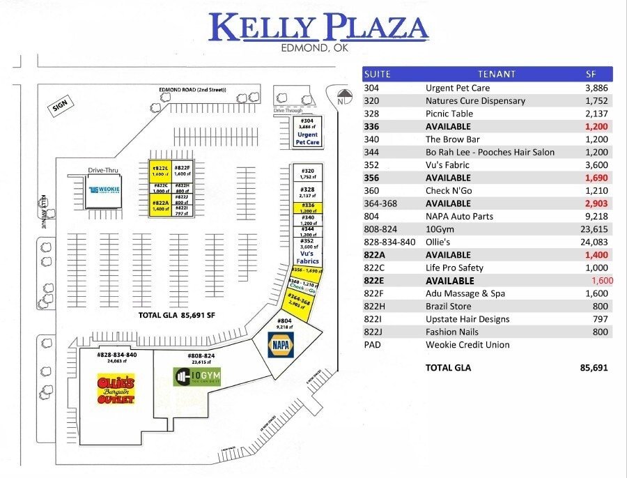 Kelly Plaza 800-828 W Edmond Rd Espace disponible | 111–817 m² | Local commercial | Edmond, OK 73003