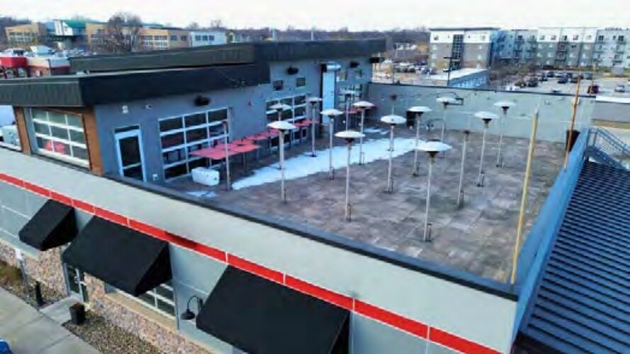 The two-story structure is thoughtfully configured for efficient restaurant operations. The first floor offers a well-equipped kitchen supported by a cooler, freezer, hood system, and all major equipment included. Multiple garage doors provide indoor–outdoor flexibility, while the covered patio enhances warm-weather service capacity. The second floor adds additional dining space with restrooms, a bar, and a large rooftop patio that creates a distinctive guest experience. A passenger elevator and dumbwaiter enhance operational flow between levels. Additional infrastructure such as dual 5,000-gallon grease interceptors, 16 outdoor gas heaters, drop-down projector screens, and multiple restrooms streamline both front- and back-of-house needs.