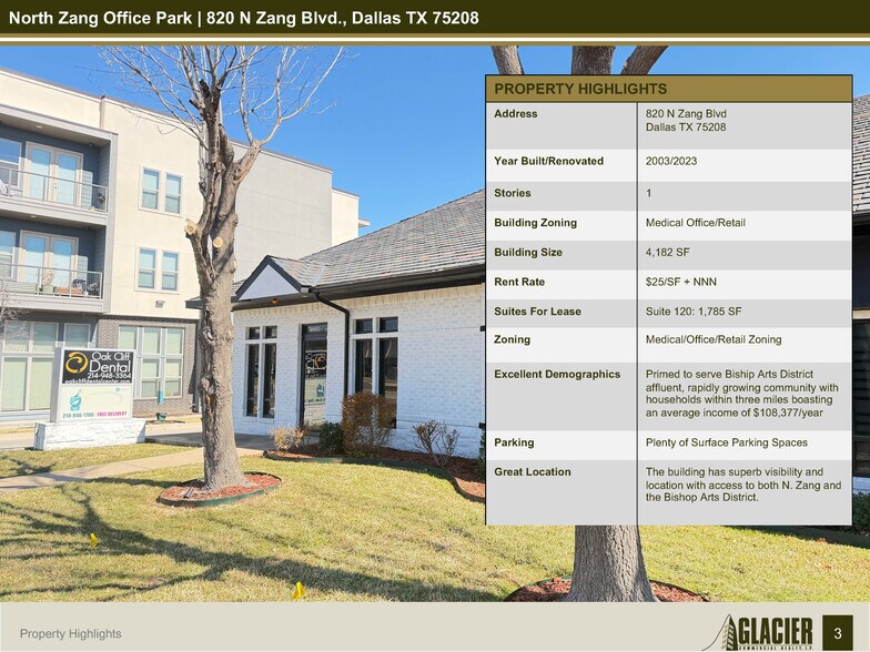 Prime second-generation medical office / retail space for lease along N. Zang Blvd with strong visibility and access to Bishop Arts. Space and use • ±1,785 SF available, configured as 2nd-generation medical office space. • Product type is Retail/Medical Office, suitable for healthcare or service-oriented retail users. Location and access • Address: 820 N. Zang Blvd, Dallas, TX, in the North Oak Cliff / Bishop Arts area. • Prominent exposure and access to both N. Zang and the Bishop Arts District. • Nearby traffic counts: Davis St. ±8,015 VPD; I-35E ±213,933 VPD, supporting strong visibility and drive-by exposure. Area demographics • 2024 population: 1-mile 18,995; 3-mile 138,764; 5-mile 382,073. • 2024 average household income: 1-mile $102,622; 3-mile $104,468; 5-mile $100,582. • Projected 2024–2029 population growth: 1-mile 3.72%; 3-mile 1.68%; 5-mile 1.07%. Bishop Arts District • Adjacent to the Bishop Arts District, a dense, walkable neighborhood with 60+ boutiques, restaurants, bars, coffee shops, theaters, and galleries. • Area known for diverse nightlife, independent retailers, colorful street art, and a mix of dining from Texas BBQ to Vietnamese, plus venues like Texas Theatre and the Kessler Theater