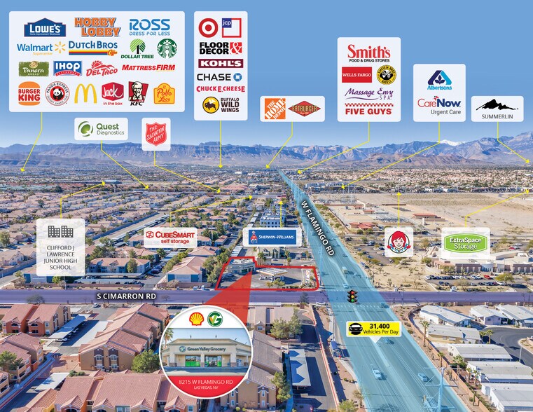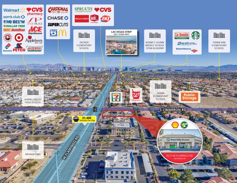 The 3,006 SF C-store with 8 fuel pumps, which qualifies for accelerated depreciation, is positioned on the hard-corner, signalized intersection of S Cimarron Road and W Flamingo Road (31,400+ VPD) and is within 2 miles of Clark County Road 215 (over 64,000 VPD). Numerous national retailers surround the subject property, including Albertsons, Cardenas Markets, Walgreens, Chase Bank, AutoZone, 7-Eleven, McDonald’s, Starbucks, Dunkin’, Jack in the Box, Taco Bell, Arby’s, and Wendy’s.