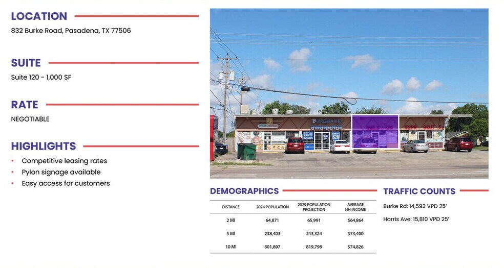 832 Burke Road – Retail Space for Lease Suite 120 | Pasadena, TX This 1,000 SF retail space offers a great opportunity for small businesses seeking a well-located and accessible storefront in Pasadena. Positioned along Burke Road, the property benefits from steady traffic, strong visibility, and convenient access. Ideal for retail, service, or office users looking to establish a presence in a densely populated and growing area.