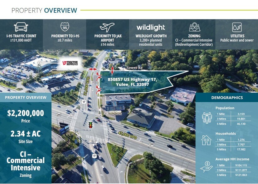 Franklin Street is pleased to present a 2.34± acre redevelopment opportunity located at 850857 US Highway 17, Yulee, FL. Positioned near the intersection of US-17 and SR A1A, the site offers strong visibility and access along one of Nassau County’s main commercial corridors connecting I-95 to Amelia Island. Currently improved with a motel, the property is zoned Commercial Intensive (CI), allowing a wide range of commercial and mixed-use uses. With steady traffic counts, surrounding national retailers, and ongoing residential growth in the Yulee and Wildlight areas, the property is well suited for retail, hospitality, or service-oriented redevelopment.