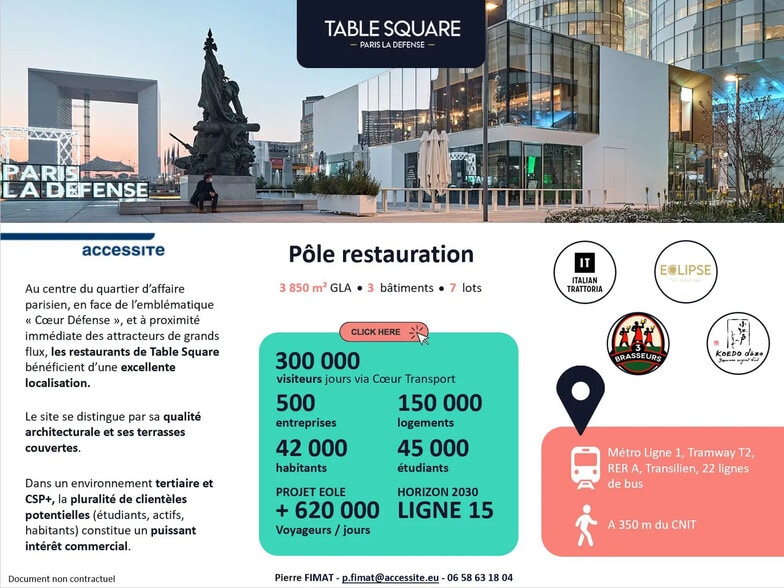Au coeur du quartier d’affaire parisien, en face de l’emblématique « Cœur Défense », et à proximité immédiate des attracteurs de grands flux, les restaurants de Table Square bénéficient d’une excellente localisation. Situés sur l'esplanade du General de Gaulle. Le site se distingue par sa qualité architecturale et ses terrasses couvertes. Cellule commerciale bientôt disponible pour de la restauration. Surfaces : 70 m² en RDC 120 m² en SS 170 m² de terrasse couverte