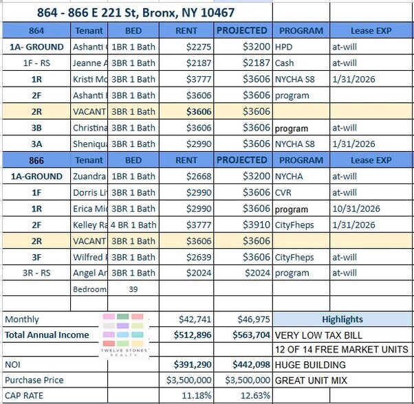 FREE MARKET ! VERY LOW TAXES!! 11 % CAP 864 E 221st St Immeuble residentiel 14 lots 3 020 045 € (215 717 €/Lot) Taux de capitalisation 11,18 % Bronx, NY 10467