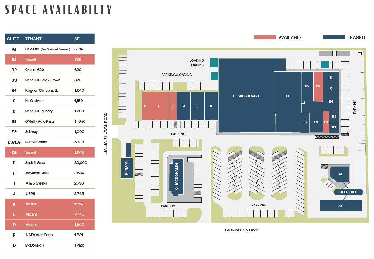 CBRE is pleased to offer the opportunity to lease space at Pacific Shopping Mall, a thriving grocery-anchored center featuring Sack N Save. This property is home to a variety of national tenants, including O’Reilly Auto Parts, McDonald’s, HELE Fuel, Subway Sandwiches, Rent-A-Center, USPS, and the Waianae Coast Comprehensive Health Clinic. Spanning 6 acres, Pacific Shopping Mall boasts 80,000 square feet of gross leasable space with 8,422 SF currently available, making it a bustling hub for both retail and community activities. The center is well-maintained and vibrant, attracting a steady flow of customers throughout the day. Located in Nanakuli, Pacific Shopping Mall serves as the first major retail destination as you travel along the picturesque Waianae Coast of Oahu. It is just minutes away from the renowned Ko Olina and Disney’s new Aulani Resort, making it a convenient stop for both locals and visitors. With over three decades of service to the community, Pacific Shopping Mall is well-established and continues to be an integral part of the local economy.