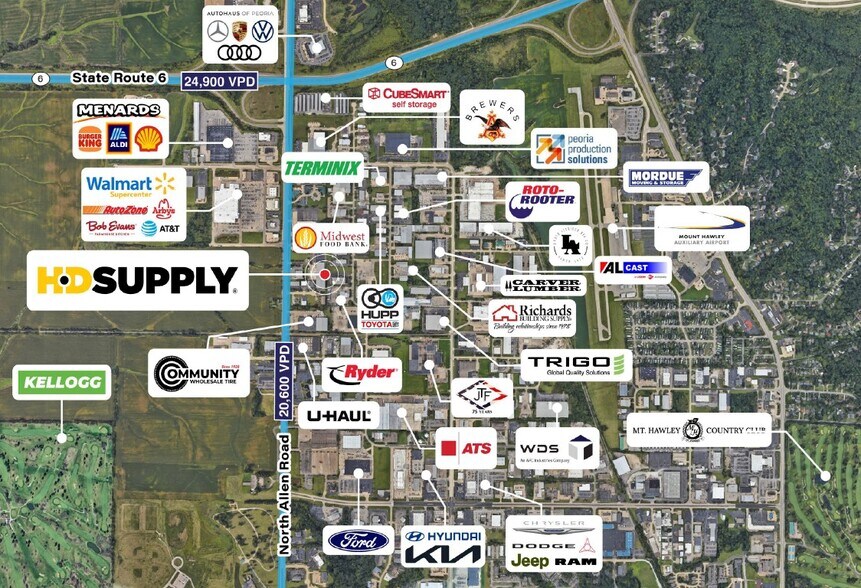 The 69,758-square-foot building bene?ts from a strategic location just off North Allen Road and State Route 6, which carry approximately 20,600 and 24,900 vehicles per day, respectively. The property is situated within a dense industrial corridor anchored by established tenants including Roto-Rooter, Advanced Technology Services, Trigo-SCSI, Brewers Distributing Co., Peoria Production Solutions, U-Haul, Ryder Truck Rental, Community Wholesale Tire, Keling Roo?ng Company, and others. Additionally, several nearby retailers, including Walmart Supercenter, Menards, ALDI, and multiple automotive dealerships (Ford, Chrysler, Dodge, Jeep, and RAM), drive strong daytime traffic to the area. Approximately 171,000 people reside within a 10-mile radius of the property, with households within a 3-mile radius earning an average household income exceeding $135,000.