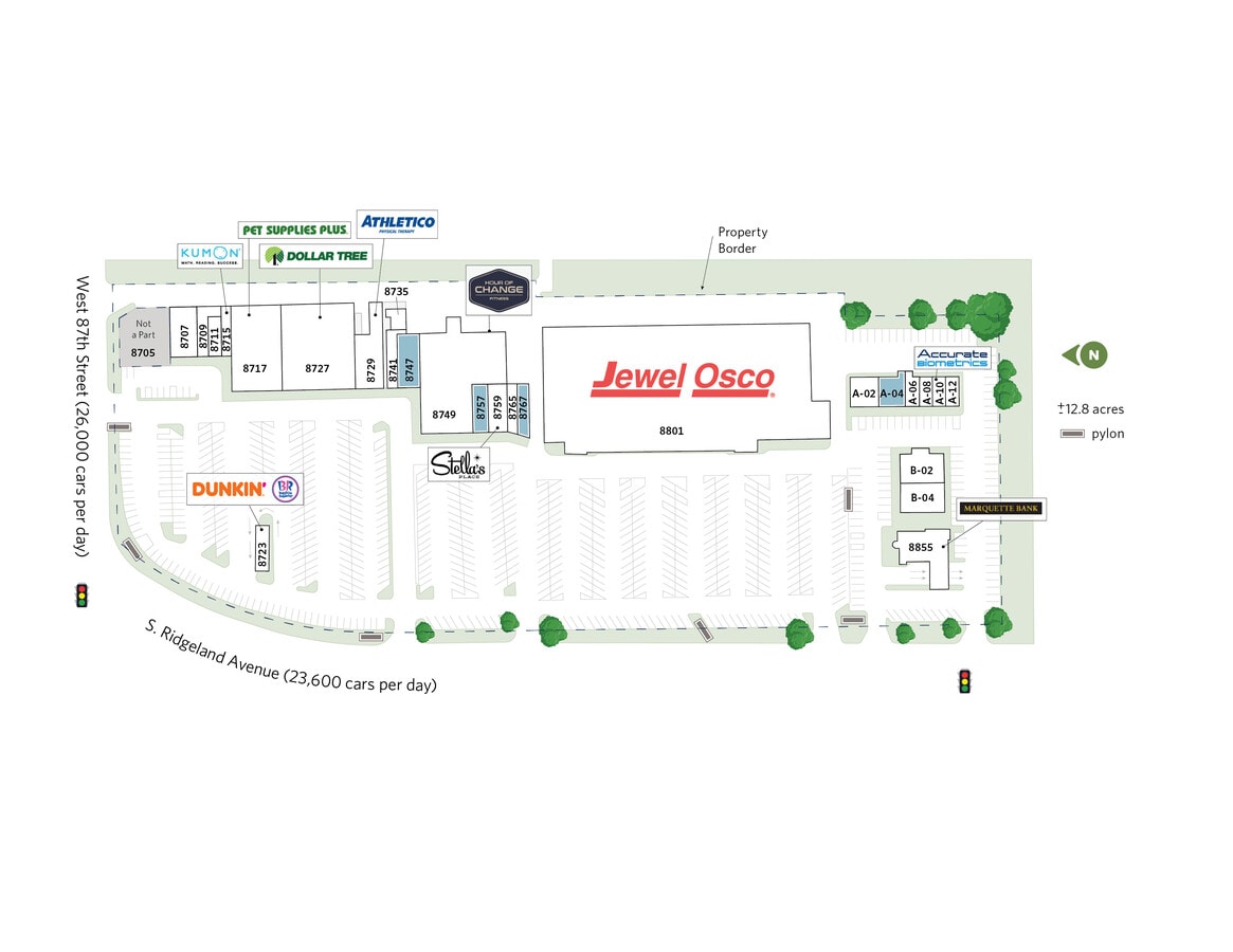 Centre commercial ancré dans Jewel-Osco situé à l'angle sud-est de l'avenue S. Ridgeland et de la 87e rue ouest. L'établissement se trouve à proximité de l'aéroport international Midway de Chicago (7,4 km) et du centre commercial Chicago Ridge (2 km). Le revenu moyen d'un ménage dans un rayon de 3 miles est supérieur à 81 000$.