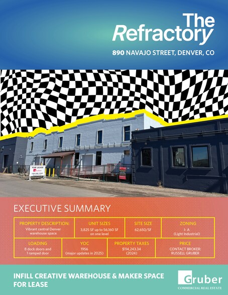 Welcome to the Refractory Central Denver Industrial Warehouse Space. This property is a infill multi-Tenant industrial property focused on community within the property. The building which is rich in Denver history was Initially a pickle production facility has since seen additions and major power upgrades. The building beyond its extremely central location also offers all new LED lighting, NEW HVAC, a fully updated building and versatile loading. The building offers spaces for lease ranging from 3,899/SF all the way up to 56,160/SF. The available spaces all have different attributes from the spaces character to clear heights and natural light opportunities. If you are looking for vibrant central warehouse space then 890 Navajo is a must see! Space sizing details are listed below. Unit 1: 12,155/SF (south end of building) Unit 2: 10,361/SF Unit 3: 7,252/SF Unit 4: 4,396/SF Unit 5: 3,899/SF Unit 6: 9,124/SF (north end of building)