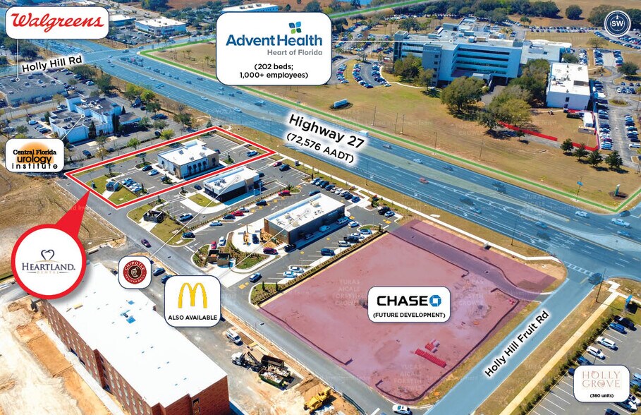 This dental practice is ideally positioned at a highly visible and accessible location near the signalized intersection of U.S. Route 27 and Holly Hill Fruit Road, which sees a combined traffic count of over 72,000 vehicles per day. The property is supported by a strong tenant, with Heartland’s network generating more than $4.2 billion in annual revenue, highlighting its scale within the U.S. dental industry. The surrounding area has experienced significant growth, with 80,724 residents within a five-mile radius, representing a 153% increase since 2010. The site is located directly across from AdventHealth Heart of Florida, a major local employer with approximately 1,000 employees, and benefits from frontage along U.S. Route 27, a primary north-south corridor capturing both local and commuter traffic, as well as visitors to nearby Disney World. Continued population and income growth within the immediate trade area further position the property and Davenport market for long-term stability and expansion.