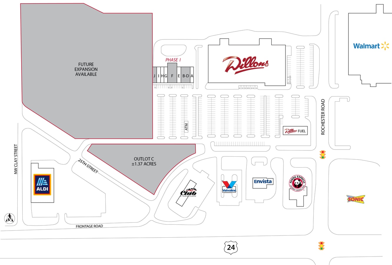 Centre commercial situé juste à la jonction du boulevard NW Topeka et de l'autoroute 24. Center est actuellement ancré par Dillons et Walmart et est situé juste en face d'un Starbucks. Près de 20 000 personnes circulent sur l'autoroute 24.