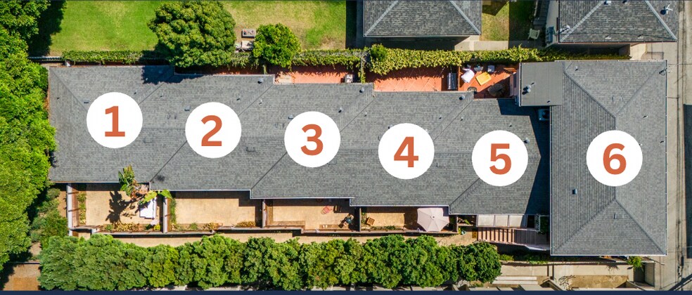 - 6 units total: An upstairs 2bd/2ba unit, plus 5 cottage-style units with private, gated front and side patios